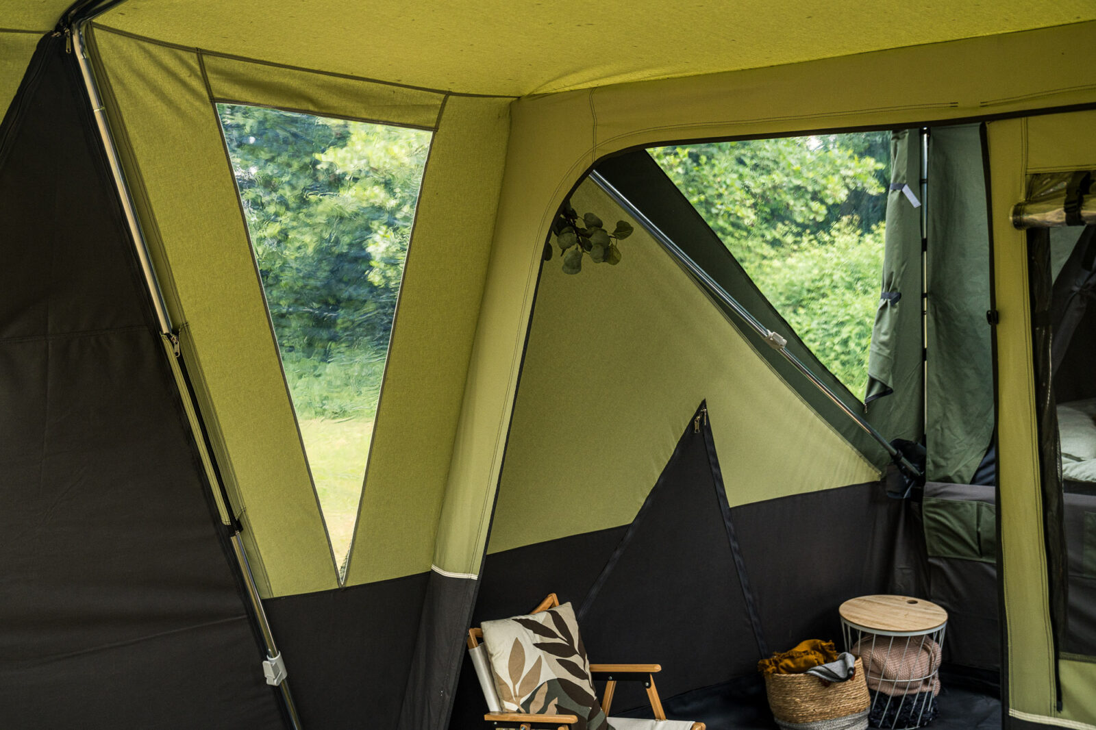 De nieuwe grote ramen zorgen voor maximale lichtinval. Zo kun je optimaal genieten van de omgeving en haal je de natuur echt naar binnen. Ook de luifel heeft een upgrade gehad, is eenvoudig op te zetten en heel stabiel door de aangenaaide tunnels. Hierdoor is het frame stevig ingeritst en blijft goed op zijn plek. Uit de wind of de zon zit je heerlijk beschut onder de luifel.