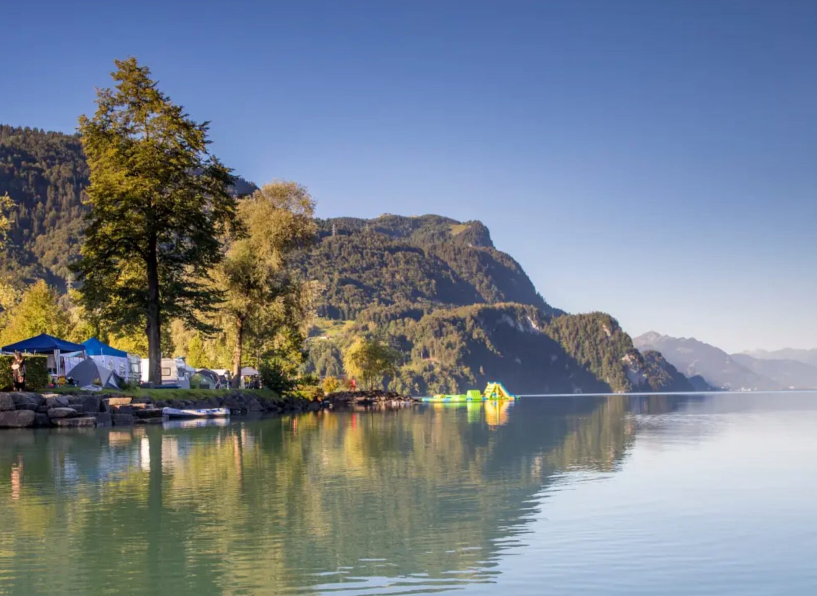 Camping Aaregg is een unieke camping in het hart van Zwitserland, direct gelegen aan de idyllische oevers van het Brienzermeer.