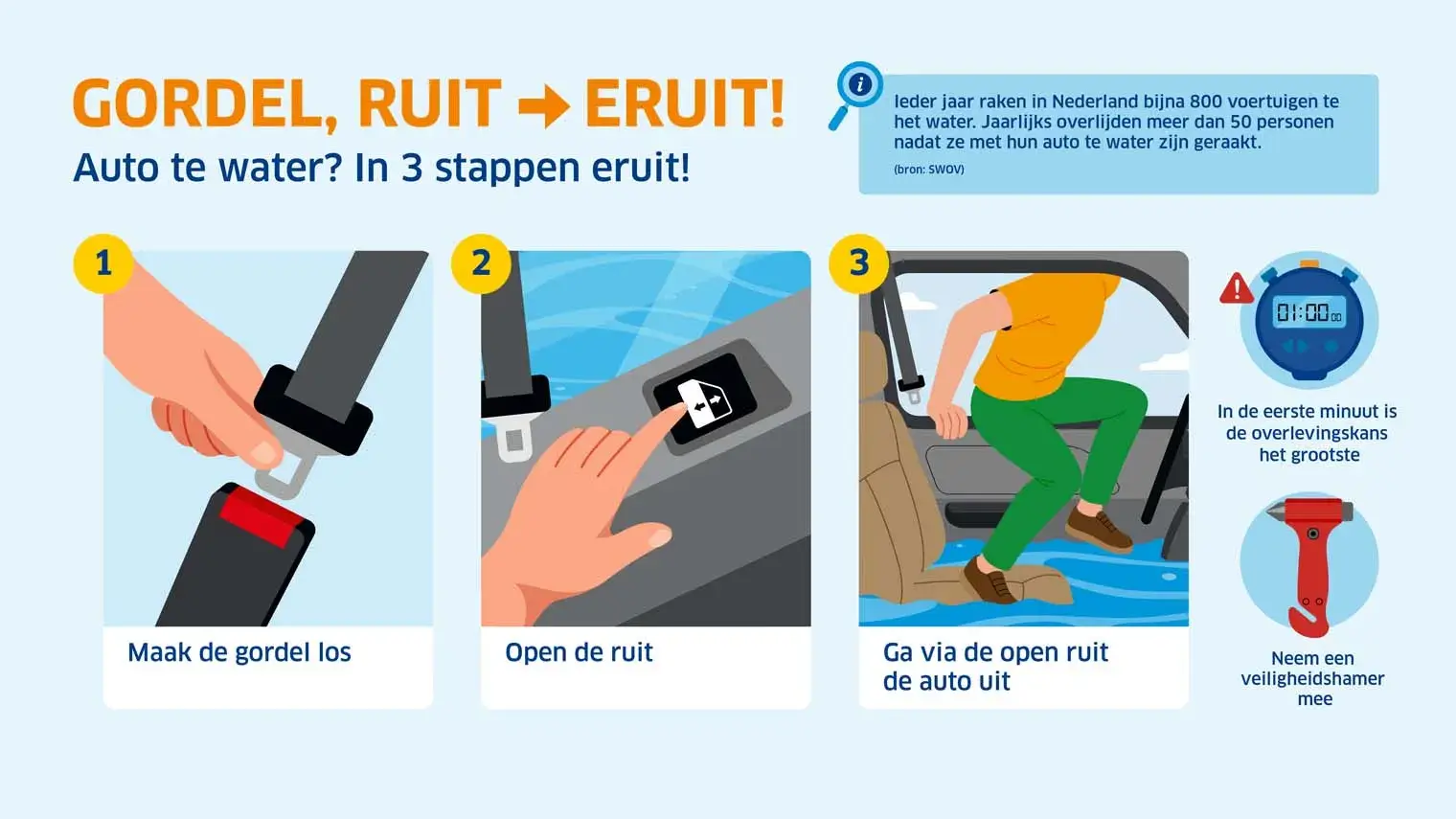 Eén daarvan is met je auto te water raken. Toch komen in Nederland jaarlijks zo’n 750 tot 800 mensen met hun voertuig in het water terecht. Helaas loopt dit niet altijd goed af en overlijden hierbij jaarlijks meer dan 50 mensen (bron: SWOV). Als je meteen in actie komt, is er een grote kans dat je snel uit het voertuig kunt komen. Maak de gordel los, open de ruit en ga via die opening de auto uit.